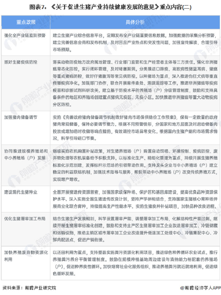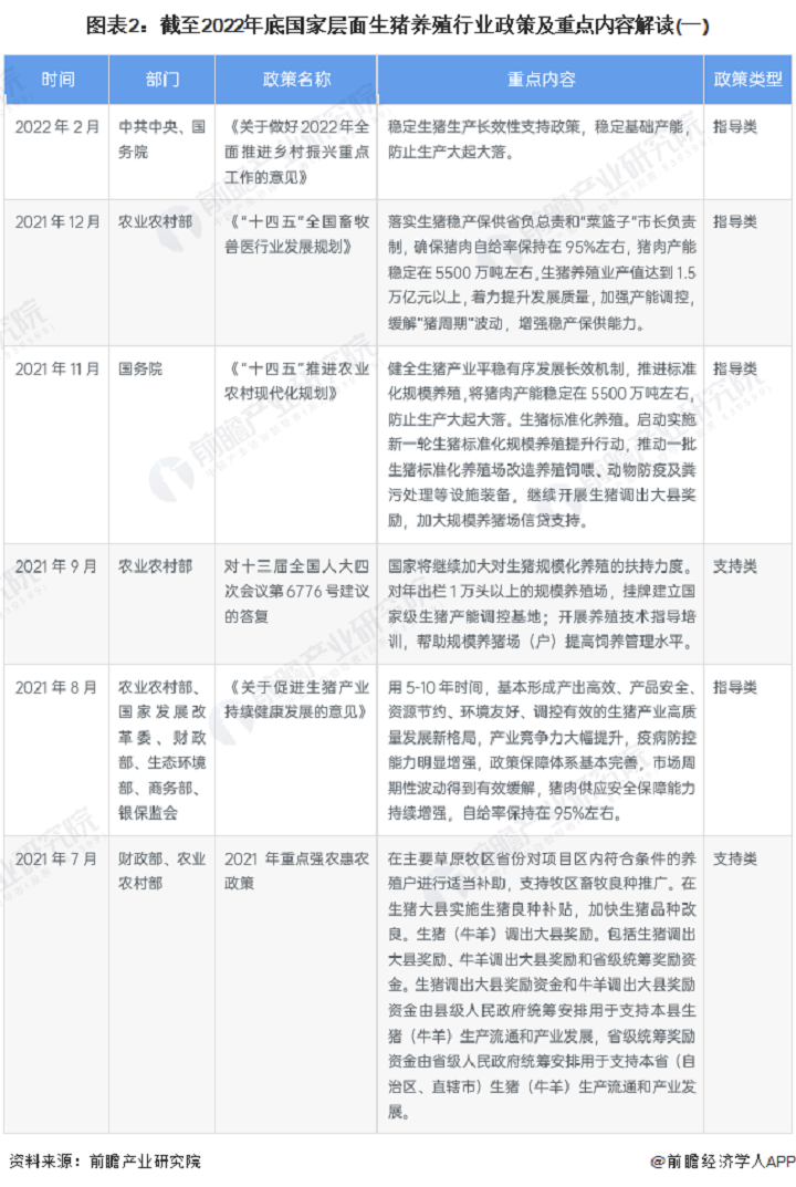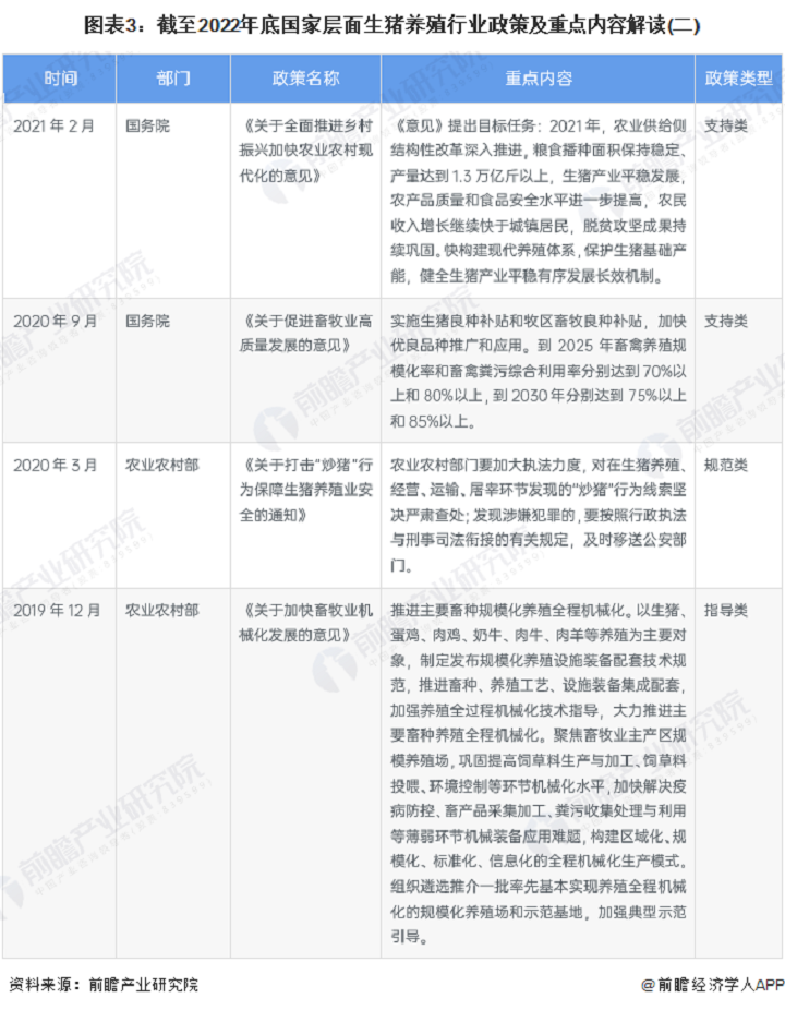 隨著經濟的不斷發展、人們生活水平的日益提高,肉類市場規模及覆蓋消費者群體不斷擴大。國家相繼出臺了多項政策,對生豬養殖行業的健康有序發展起到重要作用。具體政策如下: