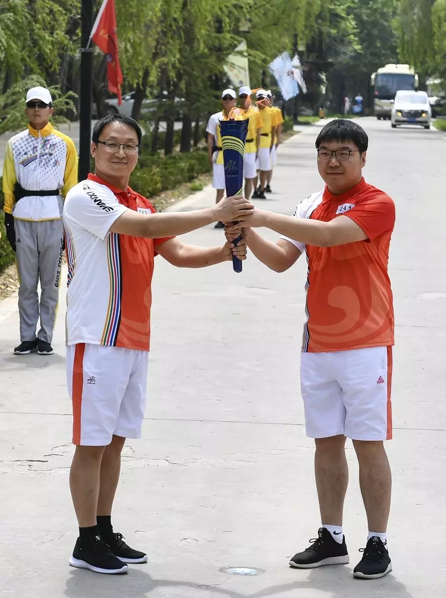 大禹生物職工代表手搖五星紅旗和“二青會(huì)”會(huì)徽“山河”旗幟,為圣火傳遞加油助威。